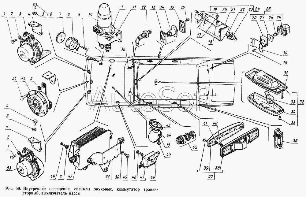 ГАЗ | ГАЗ-14 (Чайка) (1980) | 221512-П29 | Винт М3-6gх28 ОСТ 37.001.125-81 | Внутреннее освещение, сигналы звуковые, коммутатор транзисторный, выключатель массы |