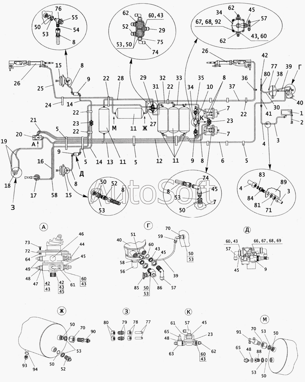 | ПАЗ | ПАЗ-4234 (2005) | 32053-3552250-30 | Шланг тормозной в сборе | Схема пневматической системы тормозов с пневмоаппаратурой | |