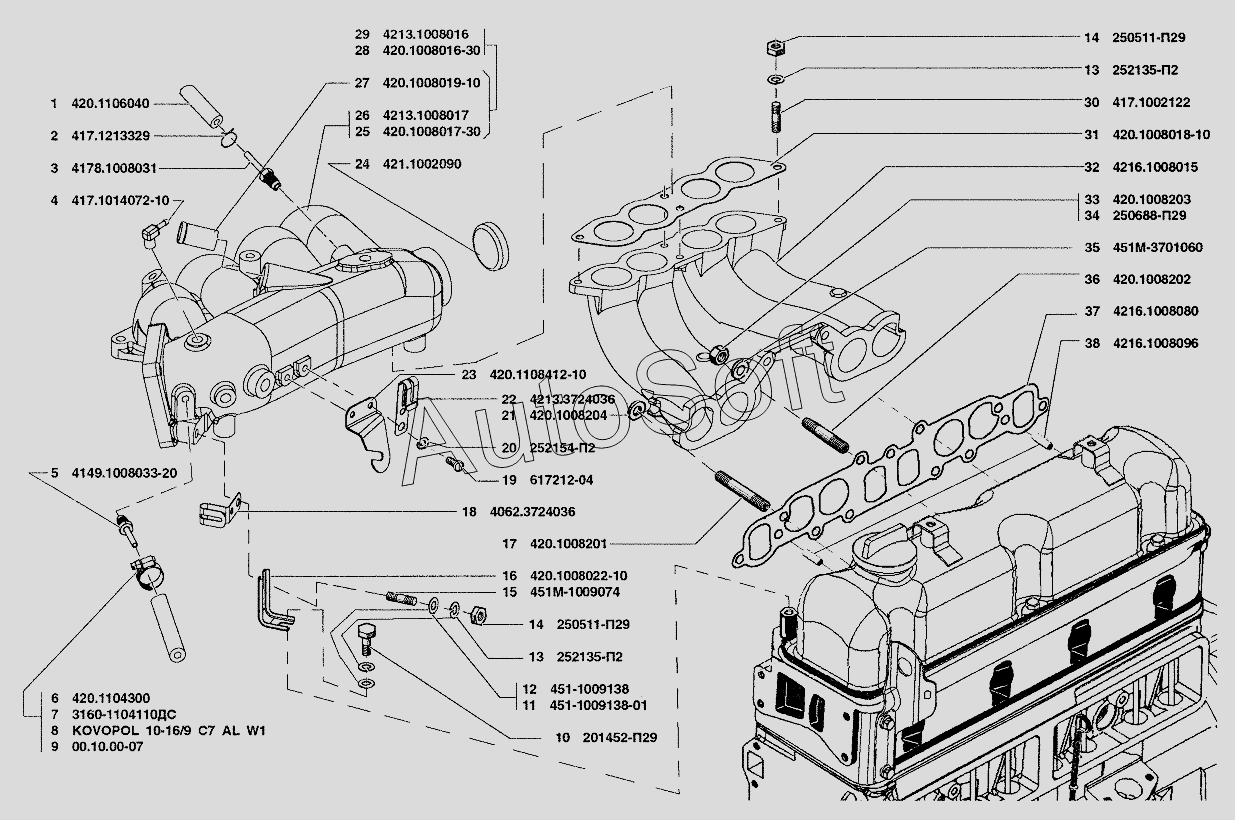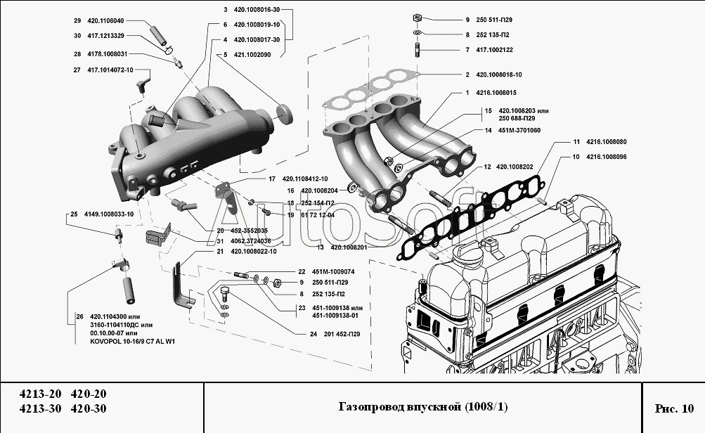 | УМЗ | УМЗ-4213, 420 (2007) | 420.1008018-10 | Прокладка ресивера | Газопровод впускной |