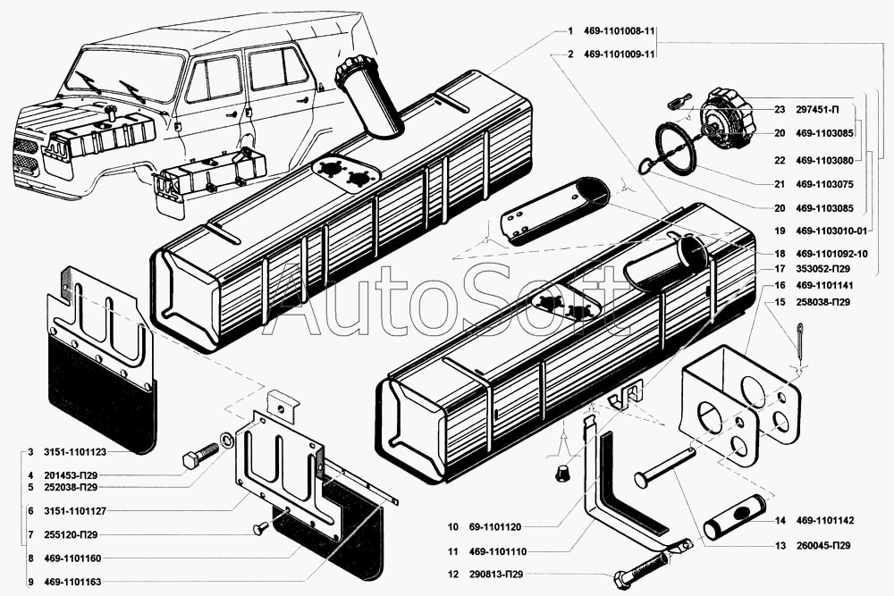 | УАЗ | УАЗ-3151 (1993) | 469-1101160 | Фартук топливного бака | Бак топливный и пробка топливного бака |