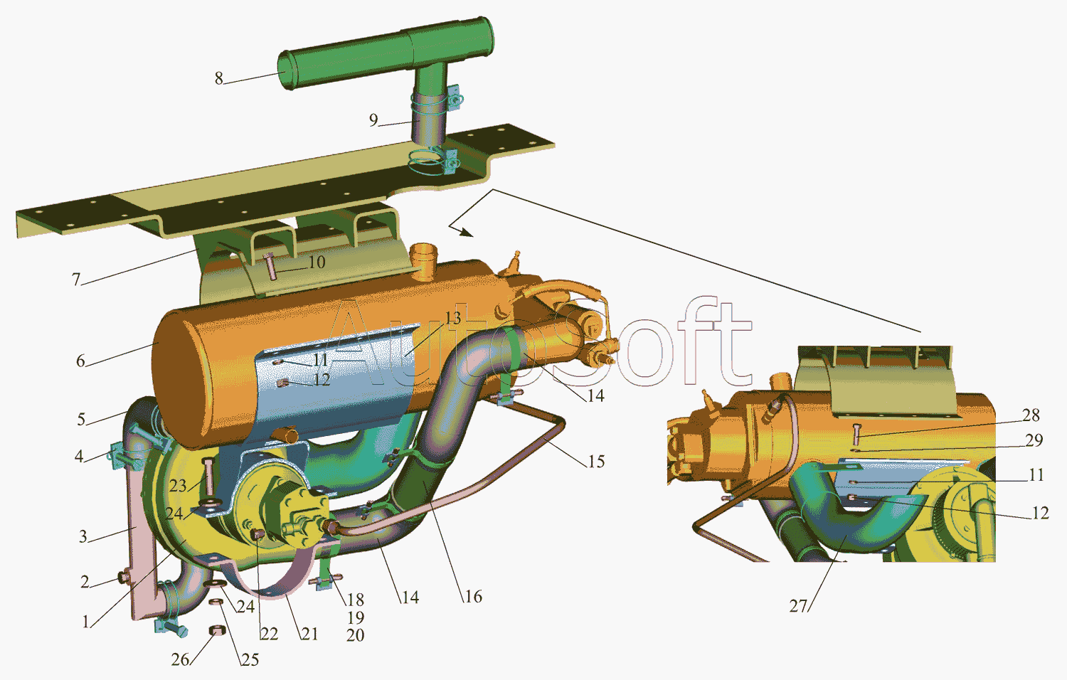 | МАЗ | МАЗ-543403, 641705, 641708 (2010) | 641708-1015030 | Труба жаровая | Предпусковой подогреватель 641708-1015006 |