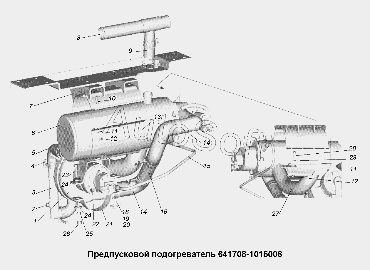 | МАЗ | МАЗ-642505, 642508 (2006) | 641708-1015030 | Труба жаровая | Предпусковой подогреватель 641708-1015006 |