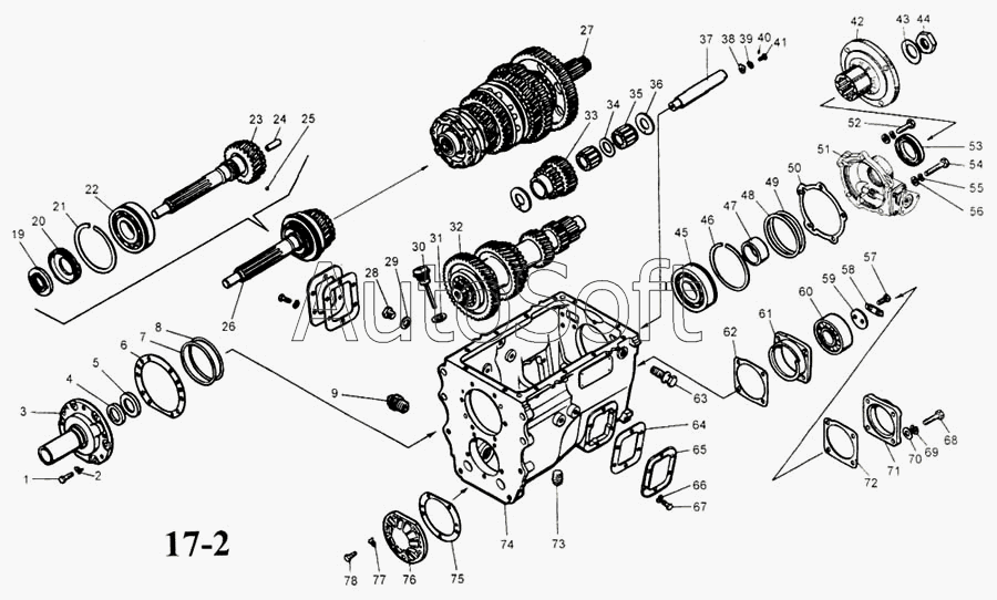 | Камский автозавод | 4326 (2001) | 64907К | Подшипник роликовый радиальный с длинными цилиндрическими роликами без колец | Кинематическая схема трансмиссии 4326 |