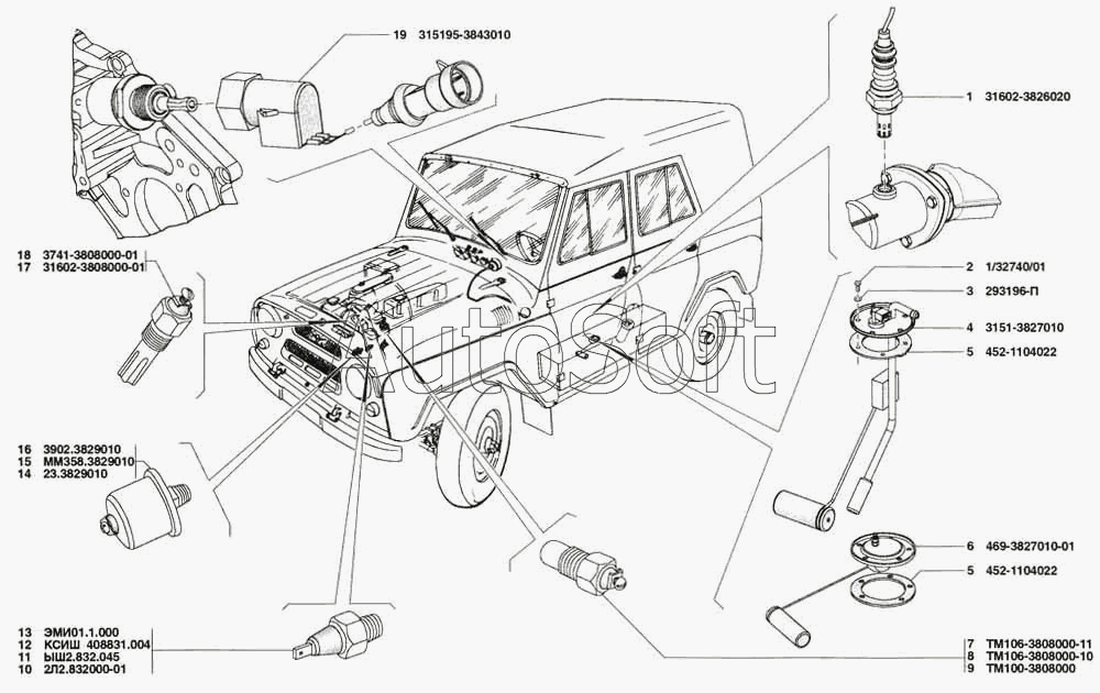 | УАЗ | УАЗ-31519 (2005) | ЭМИ01.1.000 | Датчик аварийного давления масла 6012.3829 | Приборы специальные, датчик указателя уровня топлива, датчик температуры, датчик давления масла, датчик скорости |