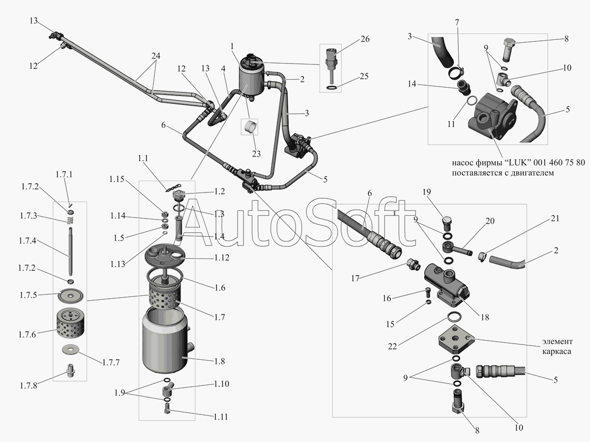 Hасос, масляный бак, клапан и трубопроводы рулевого управления