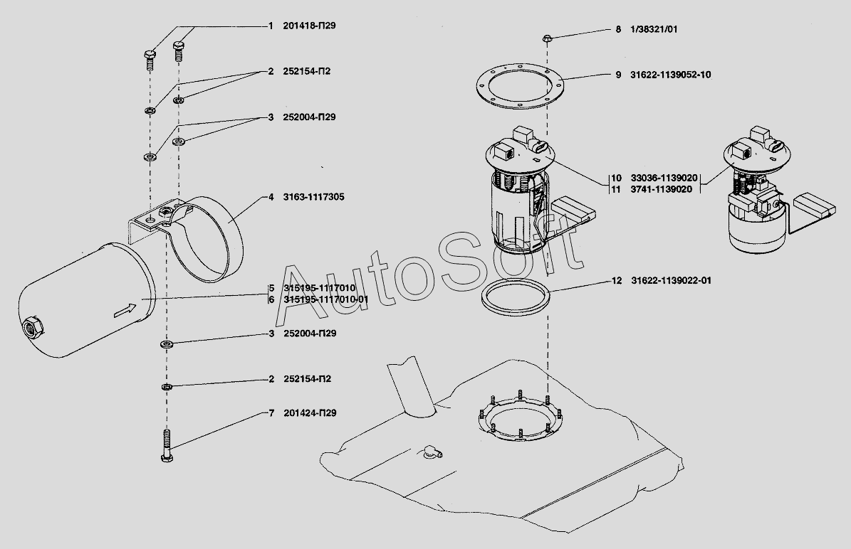 | УАЗ | УАЗ-37419 (2009) | 3741-1139020 | Электробензонасос с датчиком указателя уровня топлива | Фильтр тонкой очистки топлива, насос топливный низкого давления электрический |