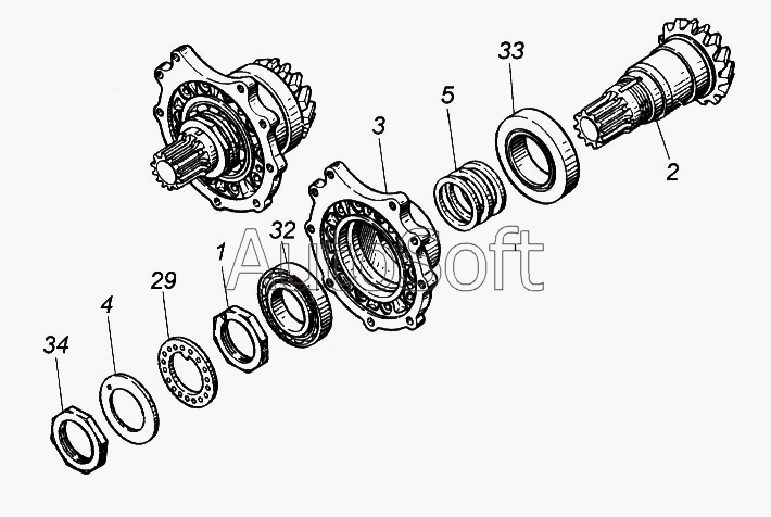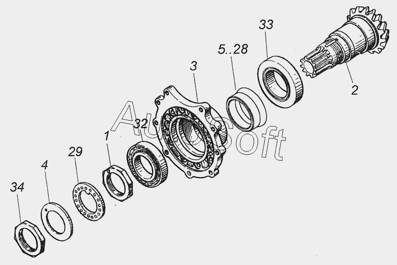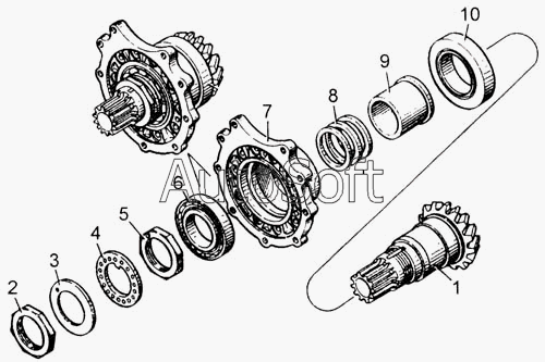 | Камский автозавод | Общий (5320, 53212, 5410, 54112, 5511, 55102) | 5320-2502063 | Гайка подшипника ведущей конической шестерни промежуточного моста в сборе | Передача главная моста промежуточного |
