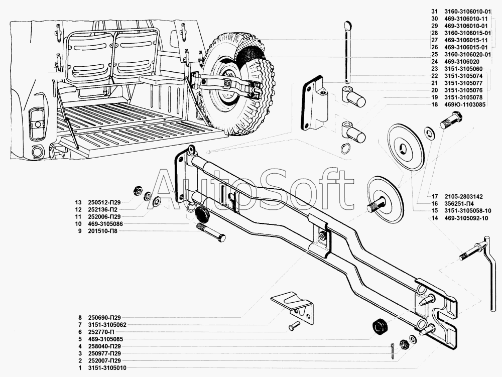 | УАЗ | УАЗ-31512 (2002) | 250690-П29 | Гайка М14х1,5 | Держатель запасного колеса, покрышки и камеры |