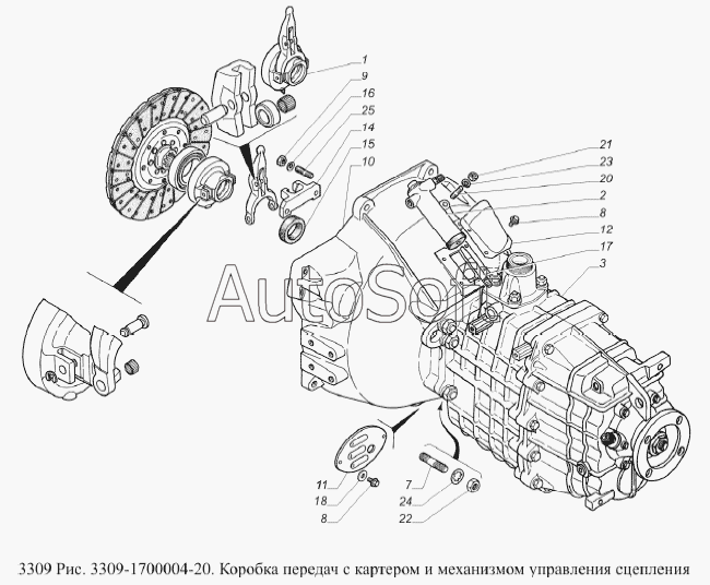 ГАЗ | ГАЗ-33081 (2008) | 3309-1601015-10 | Картер сцепления | 33081-1700004-10. Коробка передач с коробкой отбора мощности с картером и механизмом управления сцепления |
