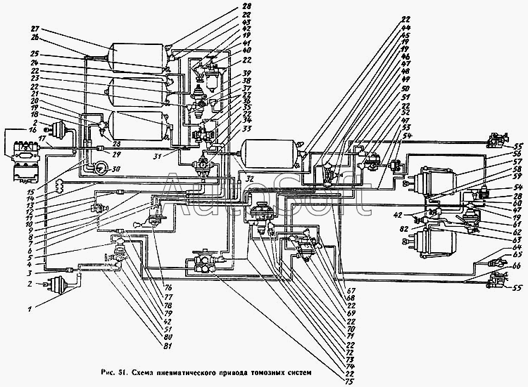 | ЗИЛ | ЗИЛ-431410 Каталог 1989 г. (1989) | 100-3522110 | Клапан управления тормозами прицепа с однопроводным приводом в сборе | Схема пневматического привода тормозных систем |