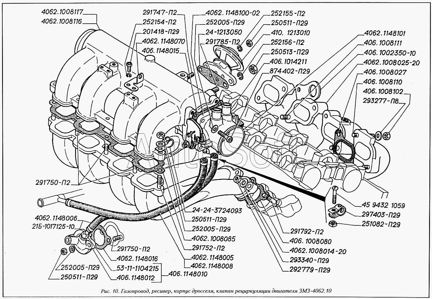 ГАЗ | ГАЗ-3110 | 4062.1008025-20 | Коллектор выпускной двигателя | Газопровод, ресивер, корпус дросселя, клапан рециркуляции двигателя ЗМЗ-4062.10 |
