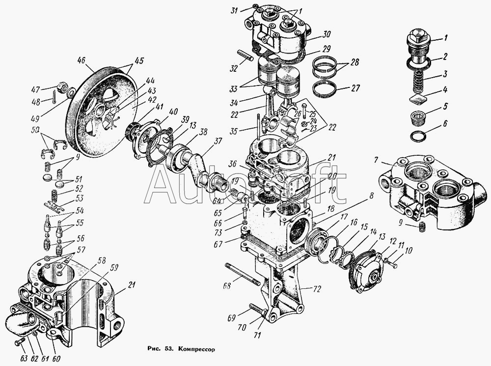 | ЛАЗ | ЛАЗ 695Н (1976) | 130-3509012-Г | Компрессор с нижней крышкой, шкивом, патрубком и регулятором давления в сборе | Установка компрессора и регулятора давления |