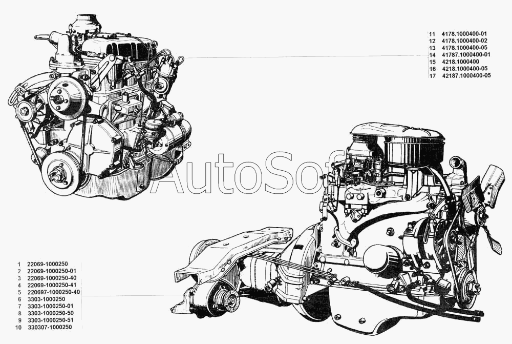 УАЗ | УАЗ 3741 (каталог 2002 г.) (2002) | 3303-1000250-51 | Двигатель в сборе (полностью укомплектованный для установки на шасси, двигатель 4178.1000400-05, коробка передач 452-1700010) | Двигатель в сборе |