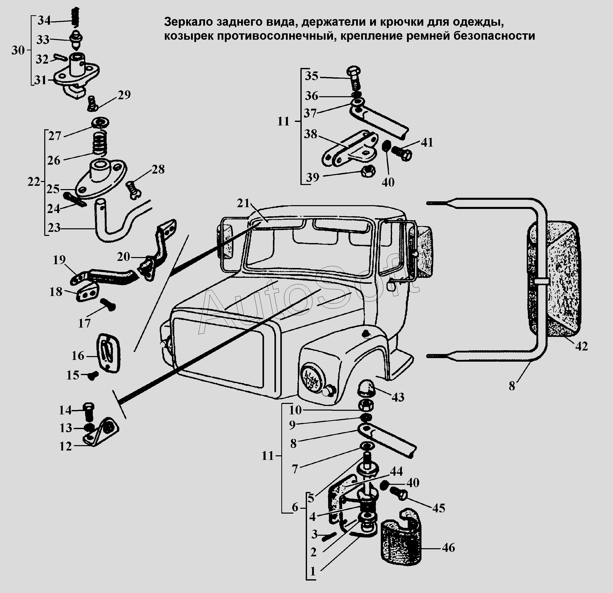 | ГАЗ | ГАЗ-3308 (2002) | 3307-8201479 | Стойка с опорой левая | Зеркало заднего вида, козырек противосолнечный, крепление ремней безопасности |