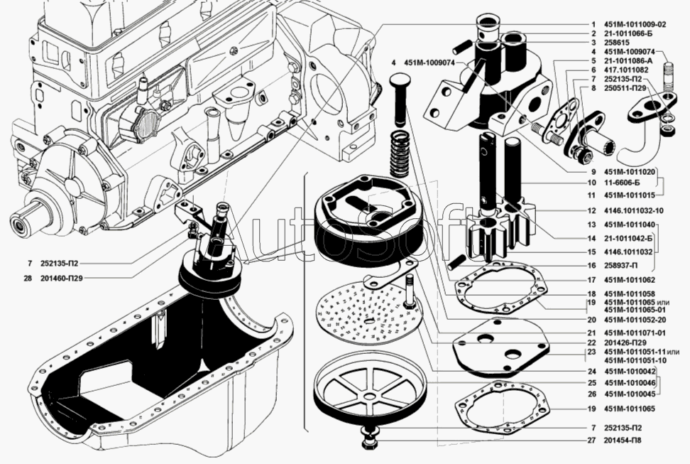 | УМЗ | УМЗ-4216 (Евро 3) (2008) | 451М-1011009-02 | Насос масляный с маслоприемником в сборе | Маслоприемник и масляный насос |