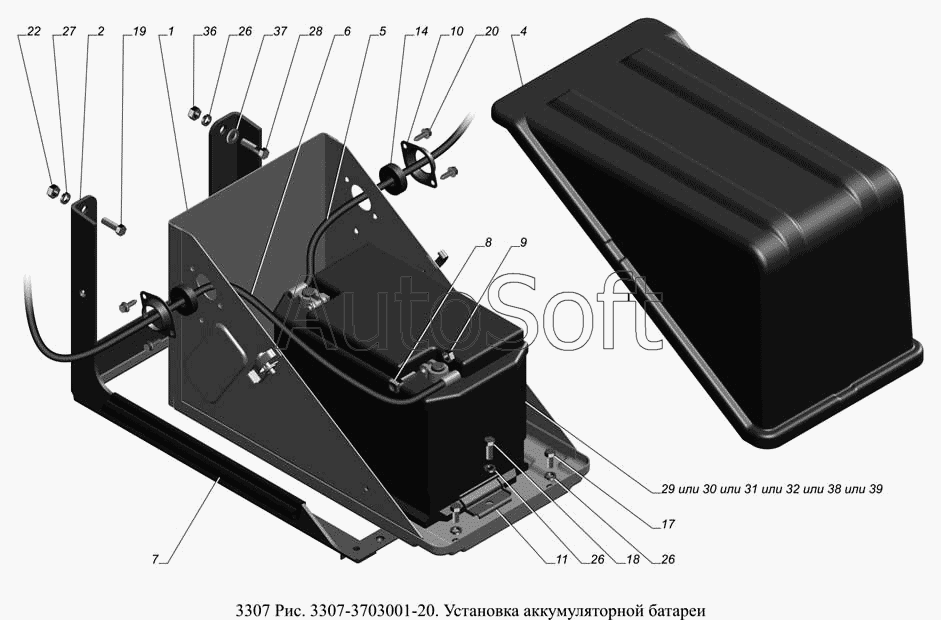 | ГАЗ | ГАЗ-3307 (доп. с дв. ЗМЗ Е 3) (2009) | 3307-3703025-10 | Основание аккумуляторной батареи | 3307-3703001-20.Установка аккумуляторной батареи |