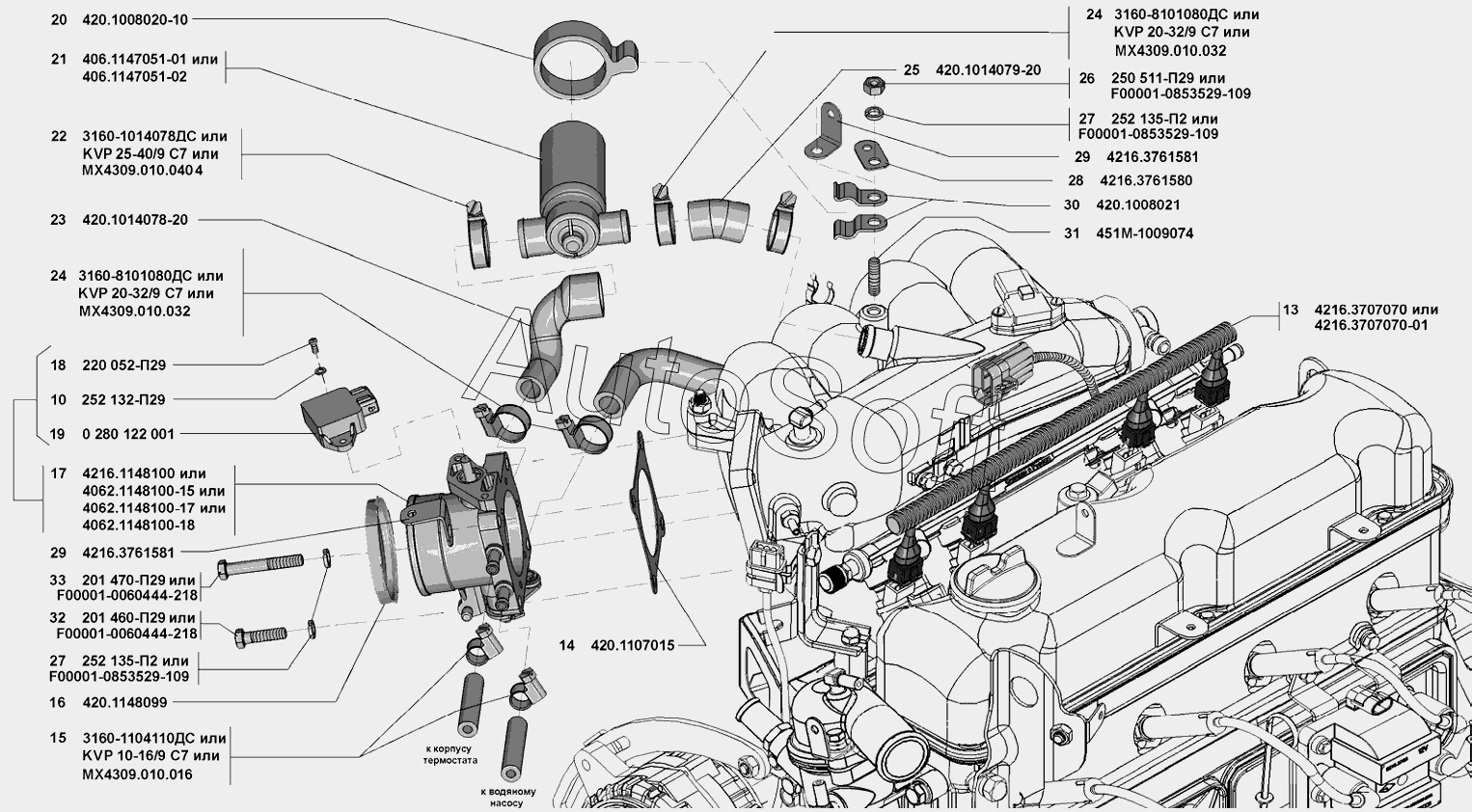 УМЗ | УМЗ-4213, 420 (2007) | 420.1014079-20 | Шланг соединительный от РХХ | Датчики температуры, детонации, углового положения дроссельной заслонки, регулятор холостого хода и жгут форсунок | |