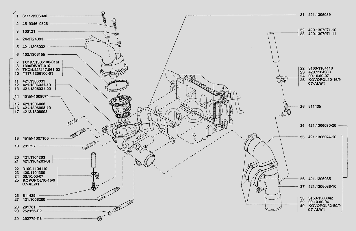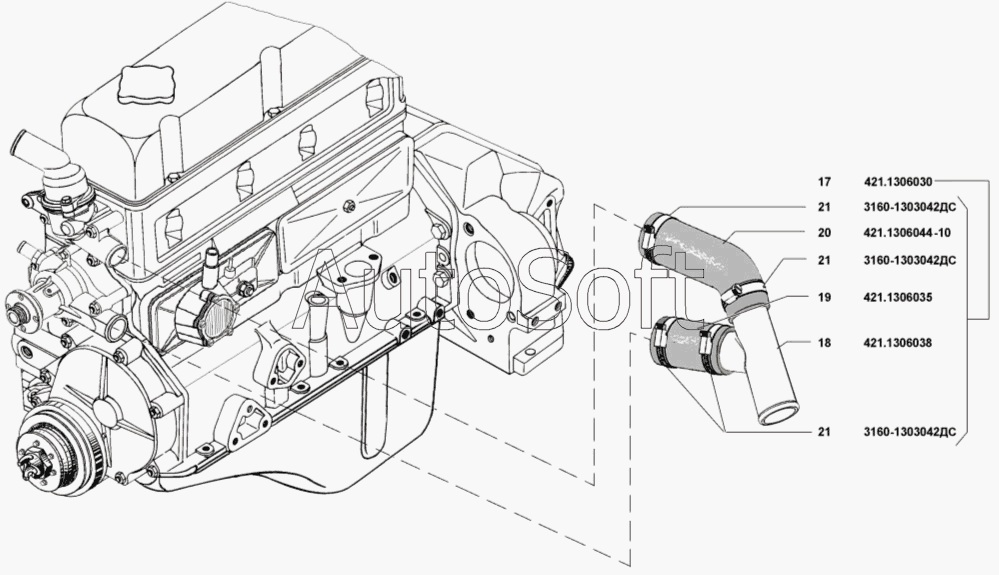 УМЗ | УМЗ-4213, 420 (2007) | 421.1306038-10 | Патрубок соединительный | Патрубок водяного насоса и термостата | |