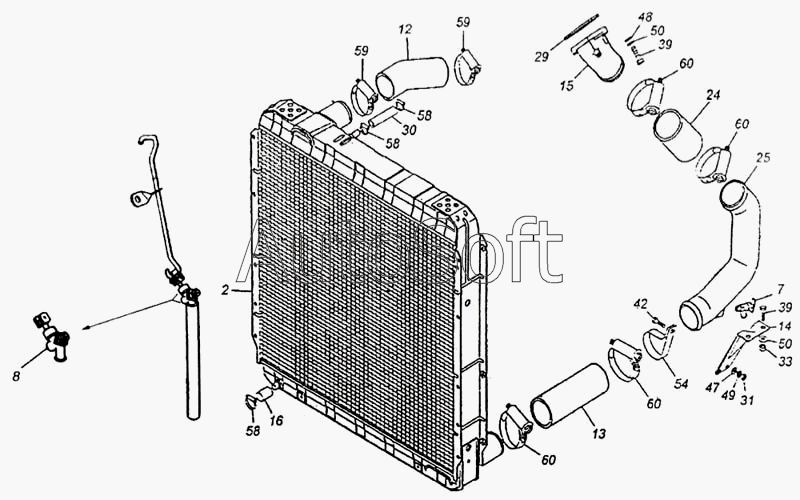 Патрубок КАМАЗ-5320 радиатора подводящий верхний L-191мм, Dвн = 56мм, Dвн = 58мм.
