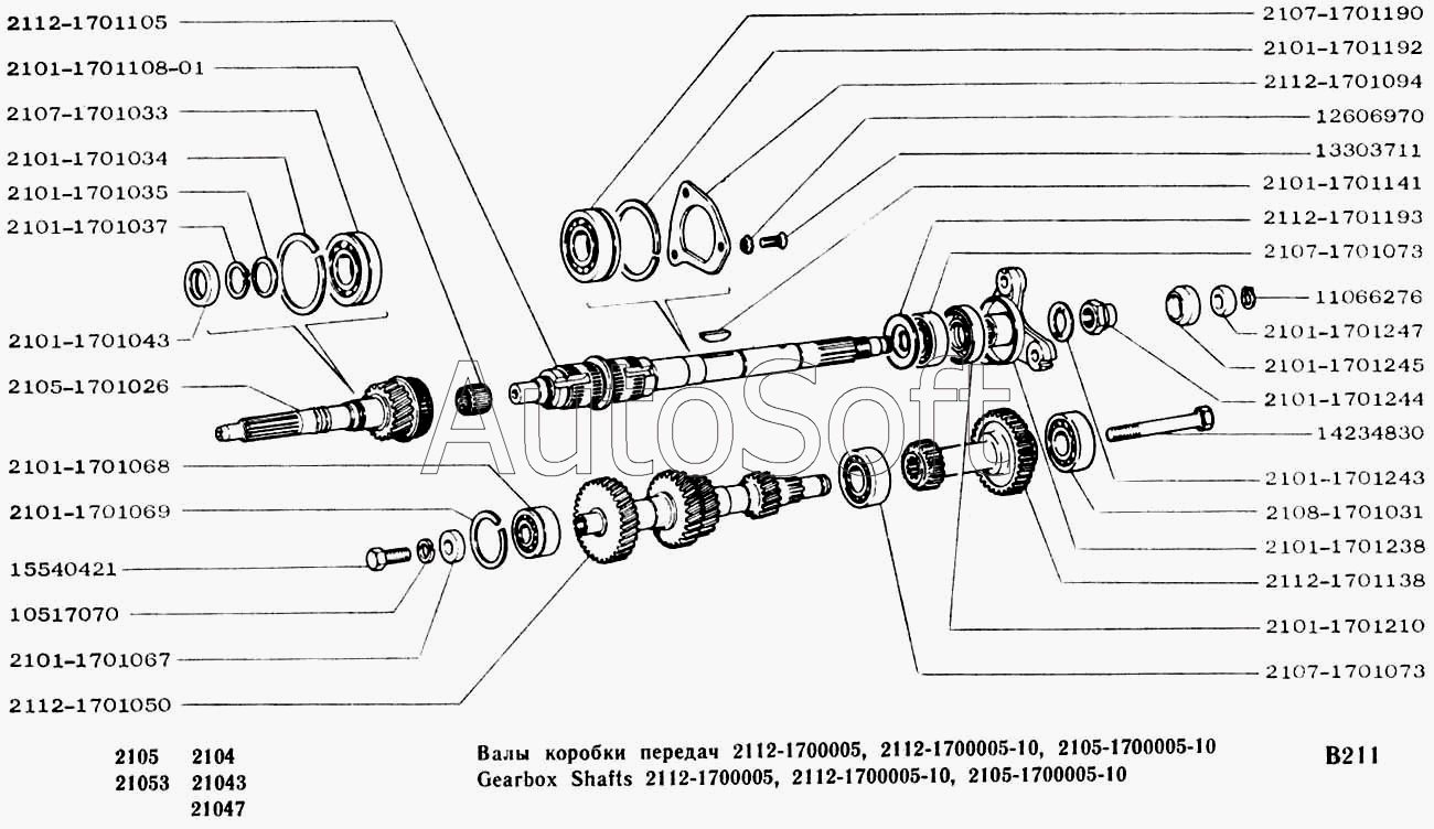 | ВАЗ | ВАЗ-2105 (2002) | 2101-1701068 | Подшипник качения (обзначение ГПЗ - 6-156704) | Схема расположения подшипников качения (вариант с четырехступенчатой коробкой передач) |