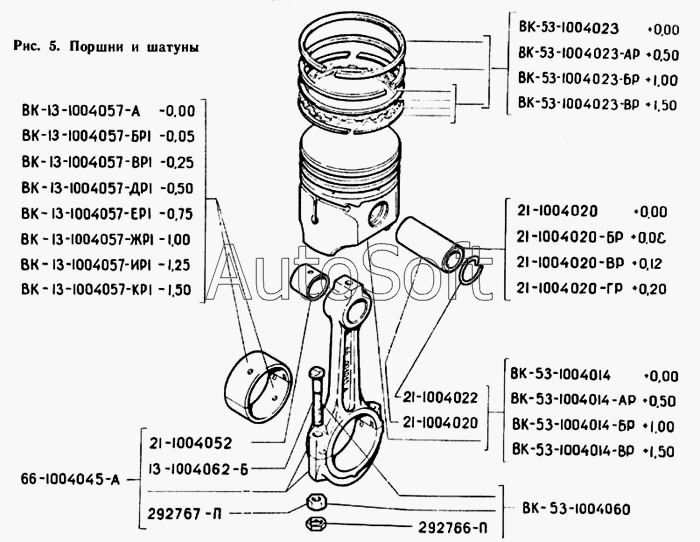 КАВЗ | КАВЗ-685 (1971) | ВК-53-1000105 | Гильза с поршнем, поршневыми кольцами, поршневыми пальцем и стопорными кольцами (комплект) | Коленчатый вал, поршни и шатуны |