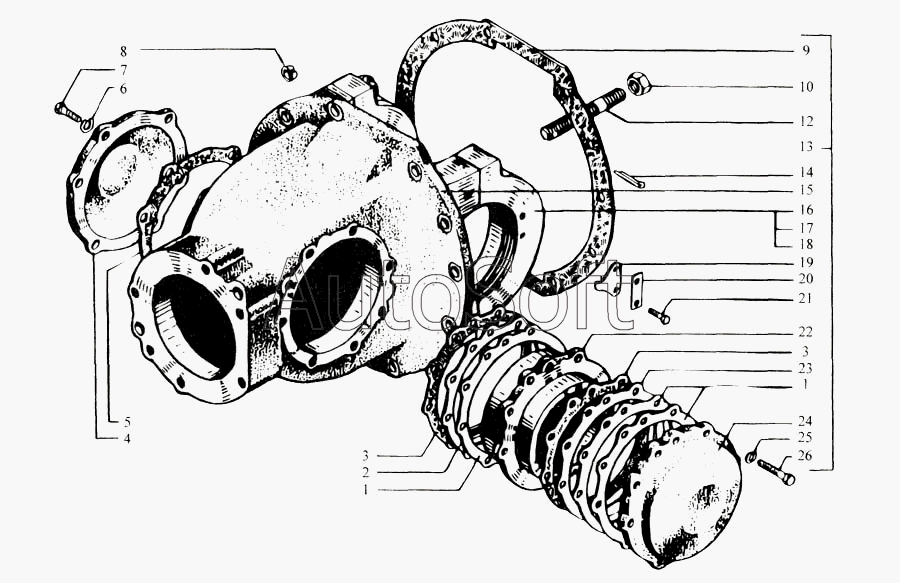 КрАЗ | КрАЗ-6443 | 260-2302015-10 | Картер редуктора с крышками подшипников дифференциала | Редуктор главной передачи и переднего моста (картер с крышками) | |