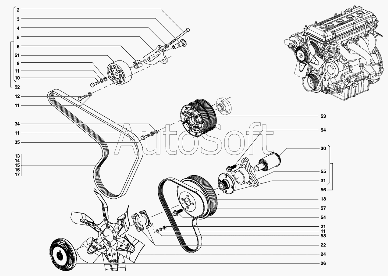| ЗМЗ | ЗМЗ-514 (Евро 2, 3) (2008) | 514.1308025-20 | Шкив водяного насоса | Вентилятор и его привод |