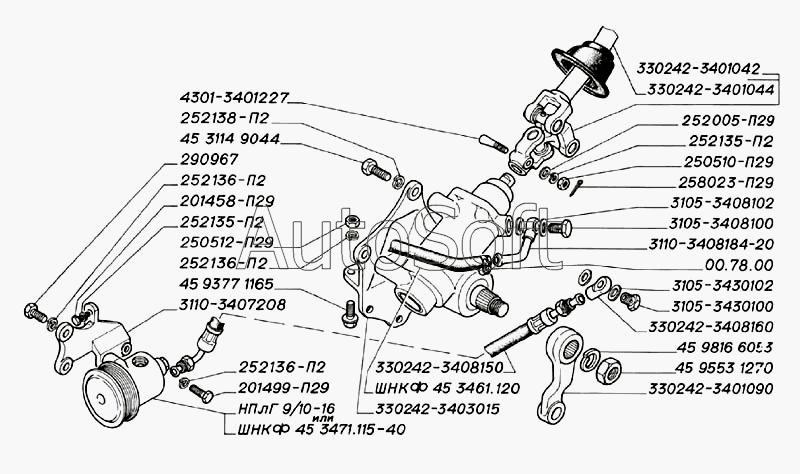ГАЗ | ГАЗ-2705 (дв. ЗМЗ-402) (2006) | 330242-3401090 | Сошка рулевого механизма | Механизм рулевого управления с гидроусилителем, вал карданный рулевой колонки, насос гидроусилителя руля (для автомобилей с гидроусилителем руля) | |