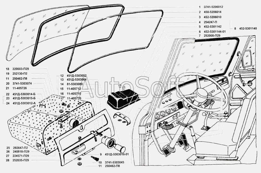 | УАЗ | УАЗ 3741 (каталог 2002 г.) (2002) | 452-5206010 | Стекло ветрового окна | Стекло, уплотнители ветрового окна передок, ящик вещевой |