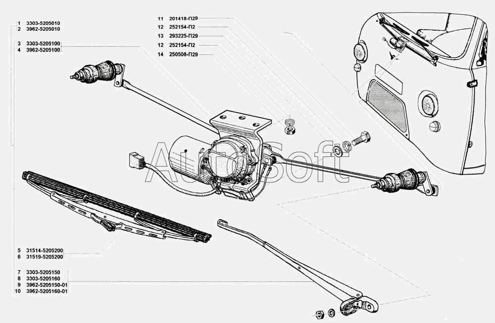 УАЗ | УАЗ-37419 (2009) | 3962-5205100 | Привод стеклоочистителя 80.5205100 | Стеклоочиститель и привод |