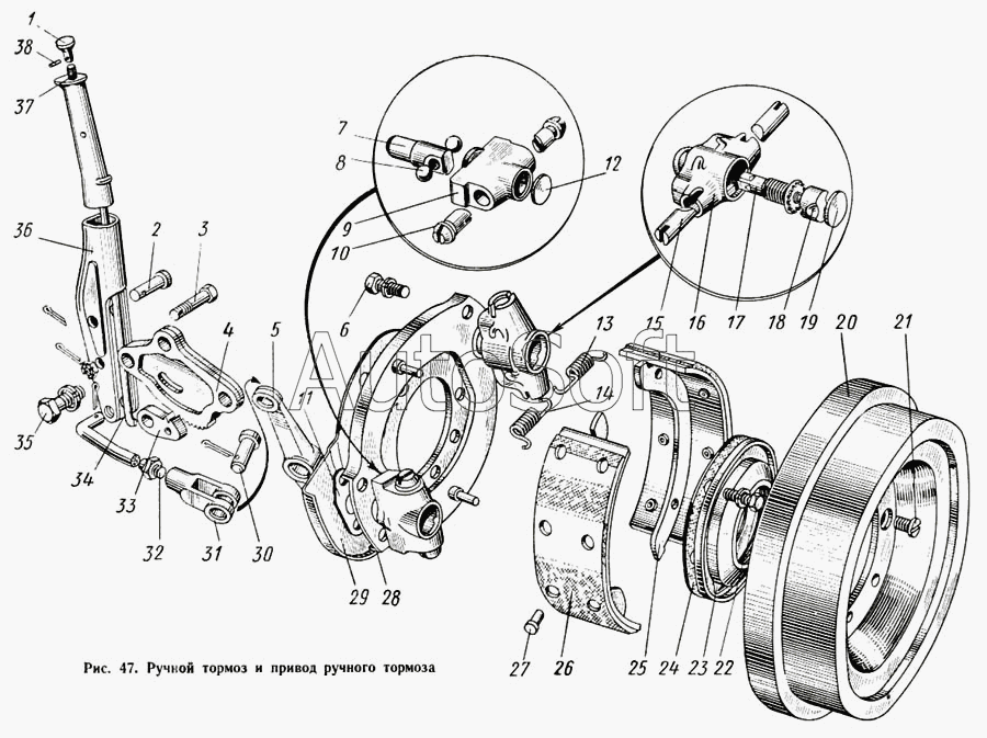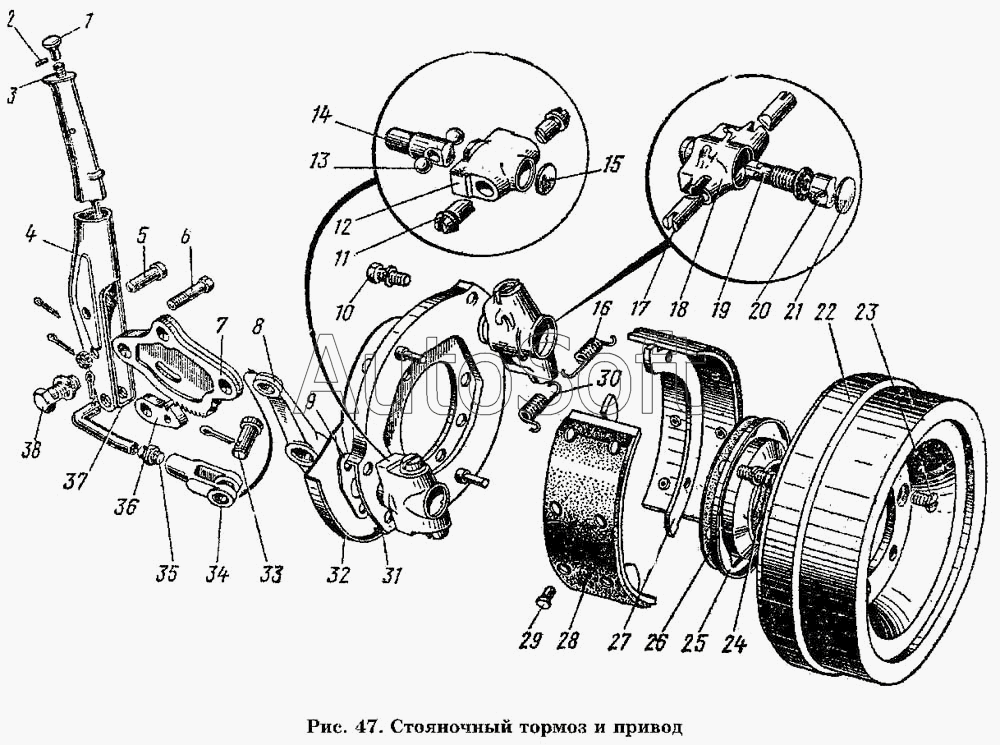 ГАЗ | ГАЗ-52-02 | 51-3507010-Б | Тормоз стояночный в сборе | Тормоз стояночный, привод механизма управления тормозами | |