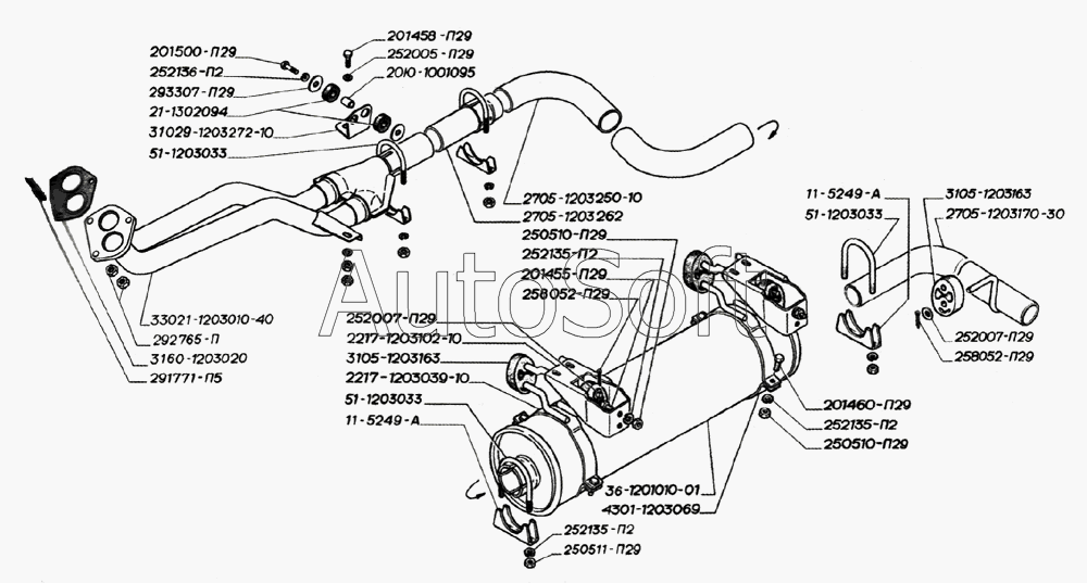 ГАЗ | ГАЗ-2705 (дв. ЗМЗ-402) (2006) | 33021-1203010 | Трубы приемные | Глушитель, резонатор, трубы и подвеска глушителя двигателей ЗМЗ-402 |