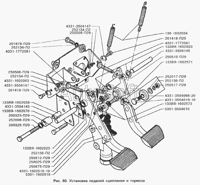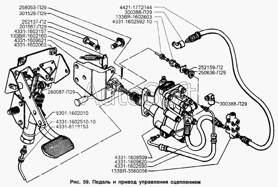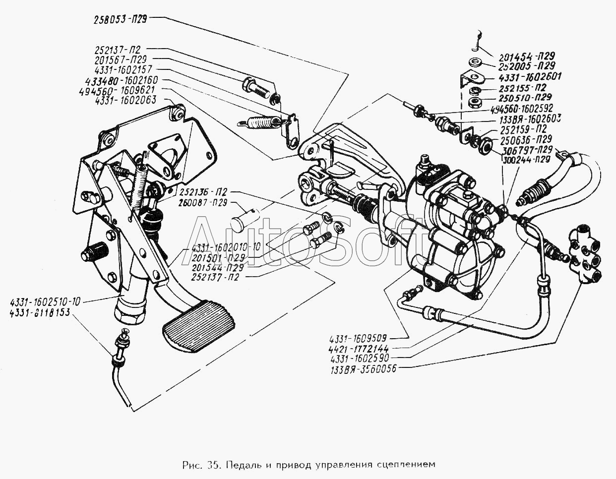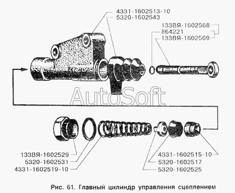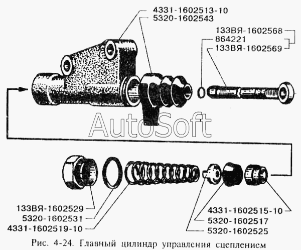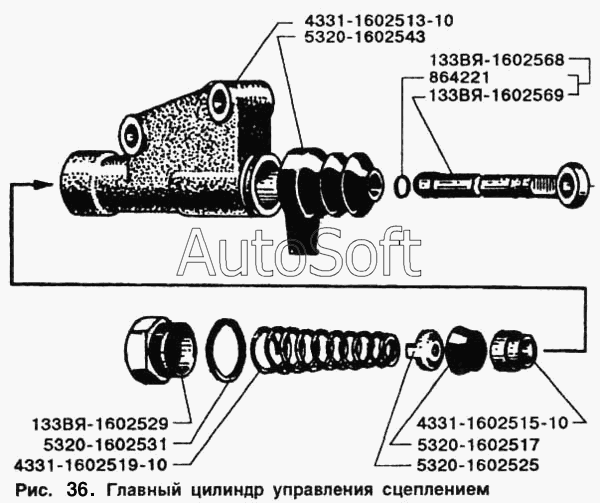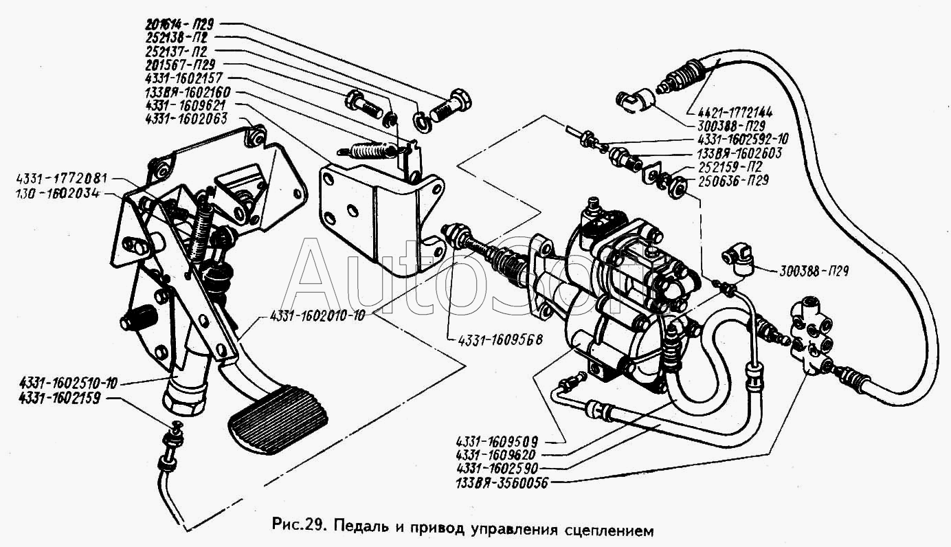 | ЗИЛ | ЗИЛ-442160 (1995) | 4331-1602510-10 | Главный цилиндр управления сцеплением в сборе | Установка педалей сцепления и тормоза |