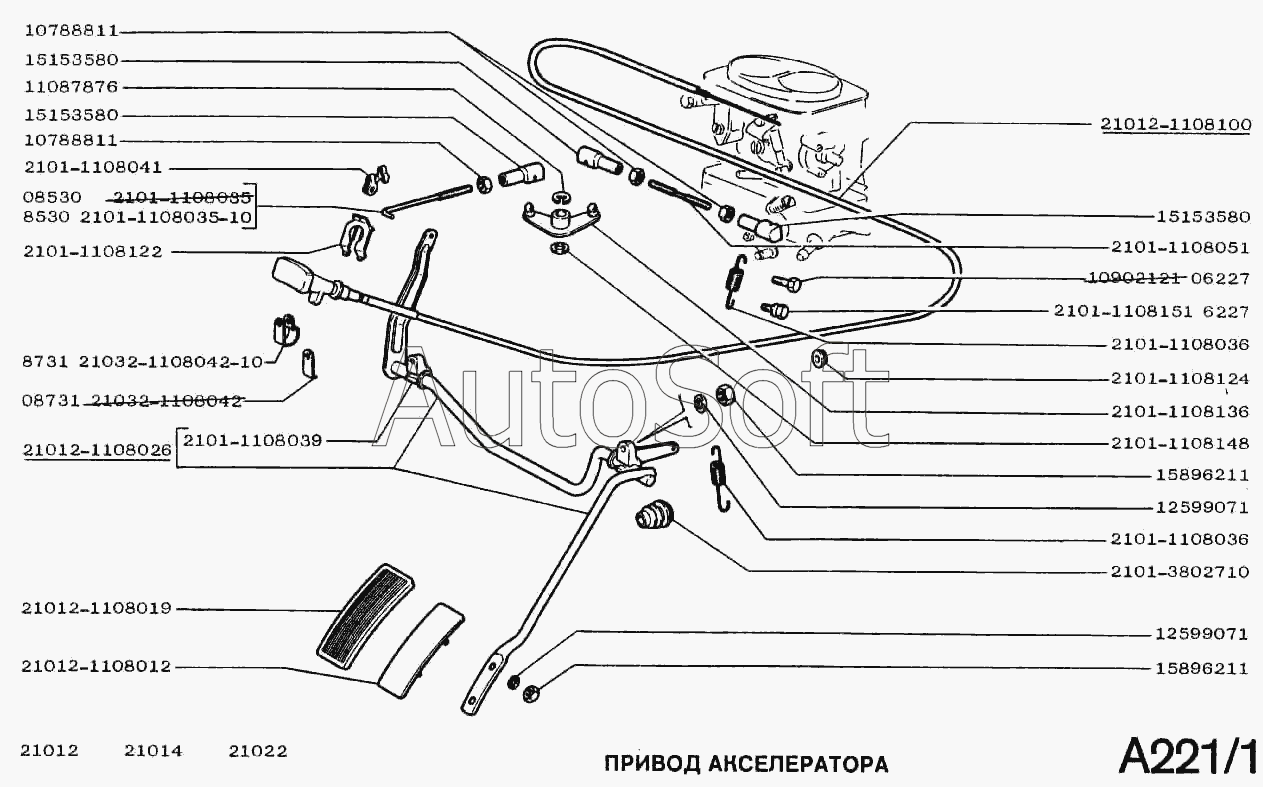 | ВАЗ | ВАЗ-2101 (1982) | 21012-1108100 | Трос с оболочкой | Привод акселератора |