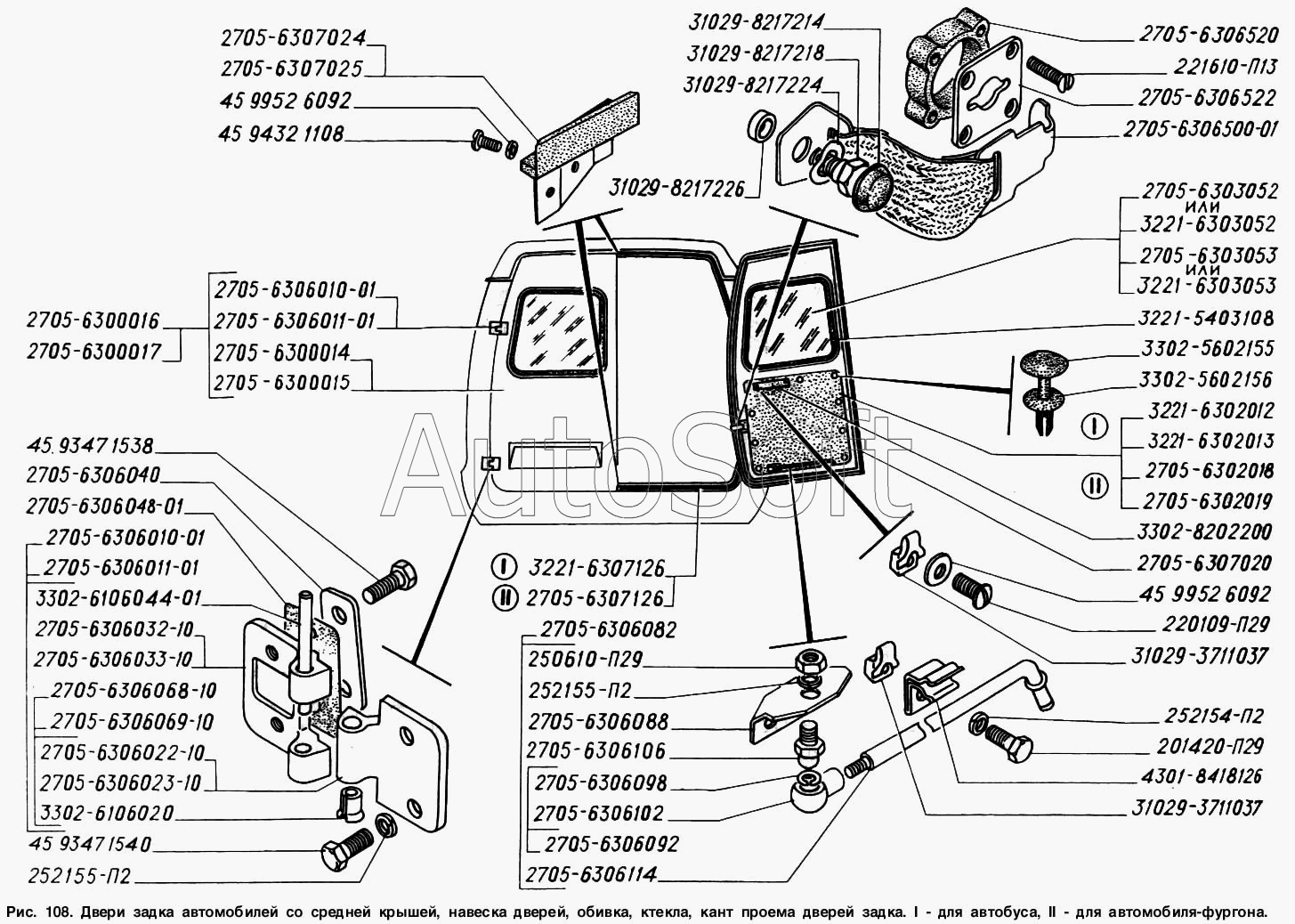 ГАЗ | ГАЗ-2217 (Соболь) (1999) | 2705-6307126 | Кант проема двери задка | Двери задка автомобилей со средней крышей, навеска дверей, обивка, стекла, кант проема дверей задка: I - для автобуса, II -для автомобиля-фургона |