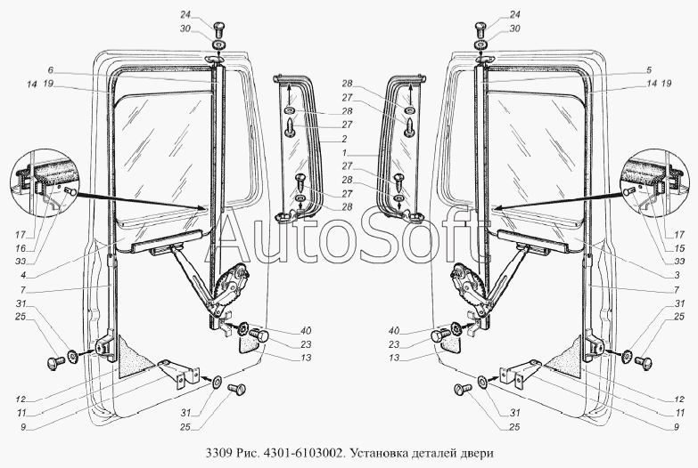 | ГАЗ | ГАЗ-3309 (Евро 2) (2008) | 4301-6103268 | Уплотнитель опускного стекла двери правый | Установка деталей двери |