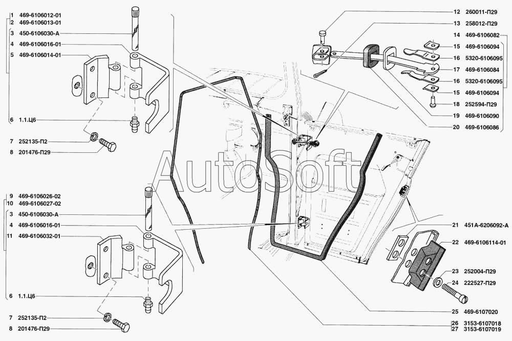 | УАЗ | УАЗ-31519 (2007) | 469-6107020 | Уплотнитель двери наружный | Навеска передней и задней дверей, уплотнения передней и задней дверей |
