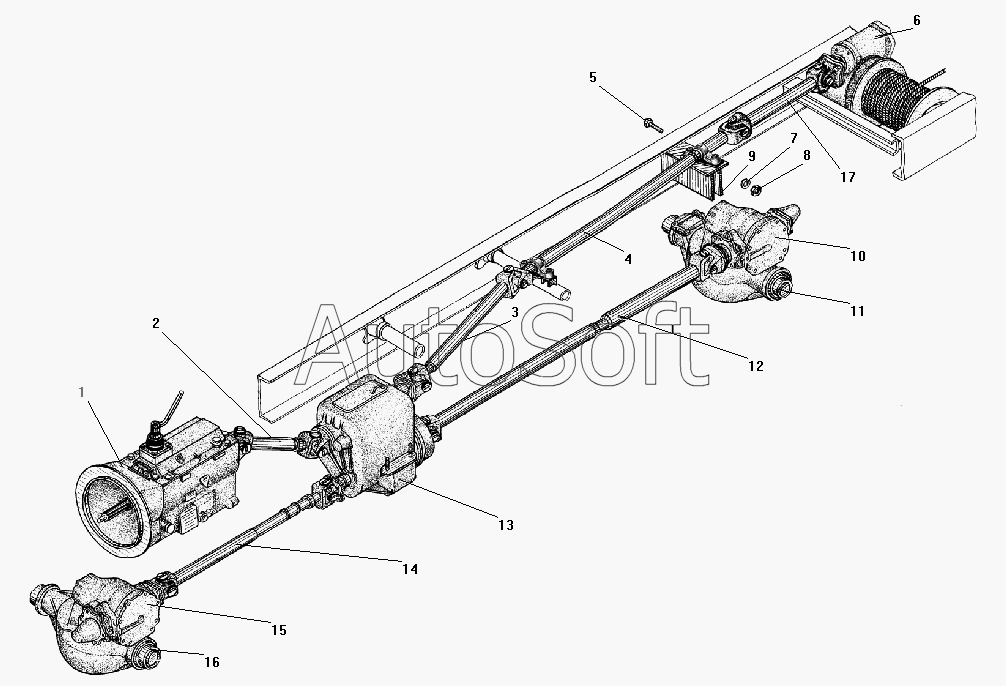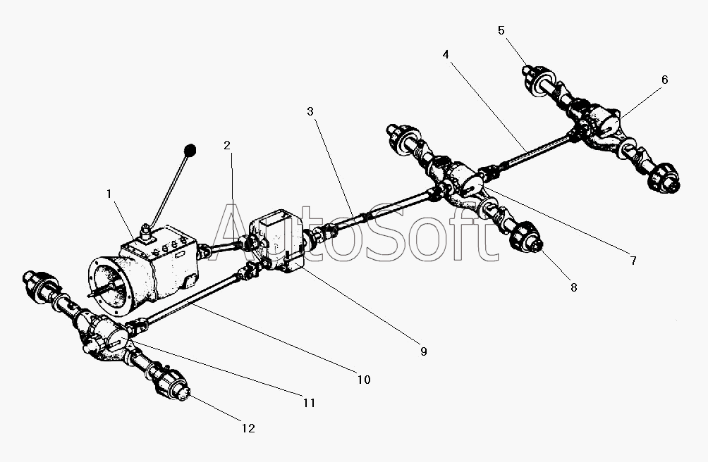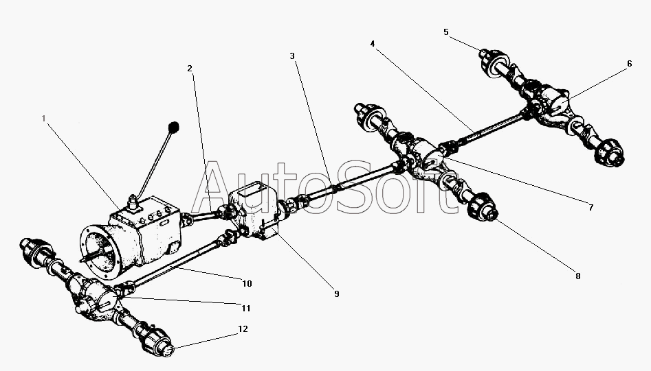 | УралАЗ | УРАЛ-5557 | 375-2202010-01 | Вал карданный промежуточный с крестовинами и фланцами в сборе | Схема расположения карданных валов, ведущих мостов и коробок передач |