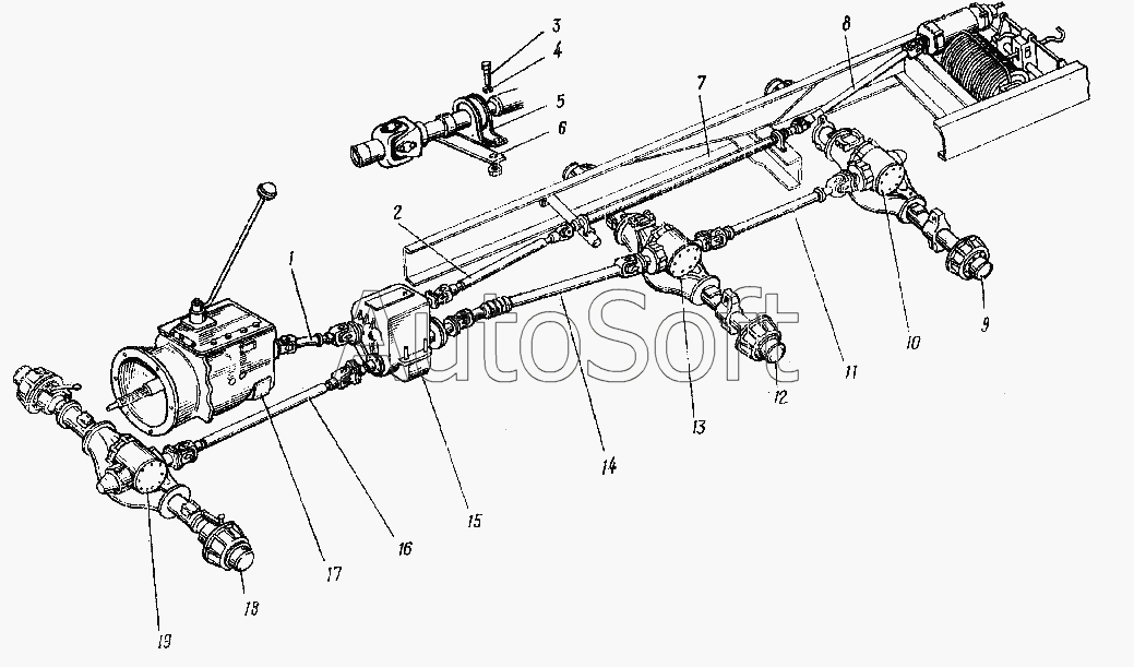 УралАЗ | УРАЛ-4320 (1981) | 375-2205010-03 | Вал карданный среднего моста в сборе | Схема расположения карданных валов автомобиля Урал-4320 |