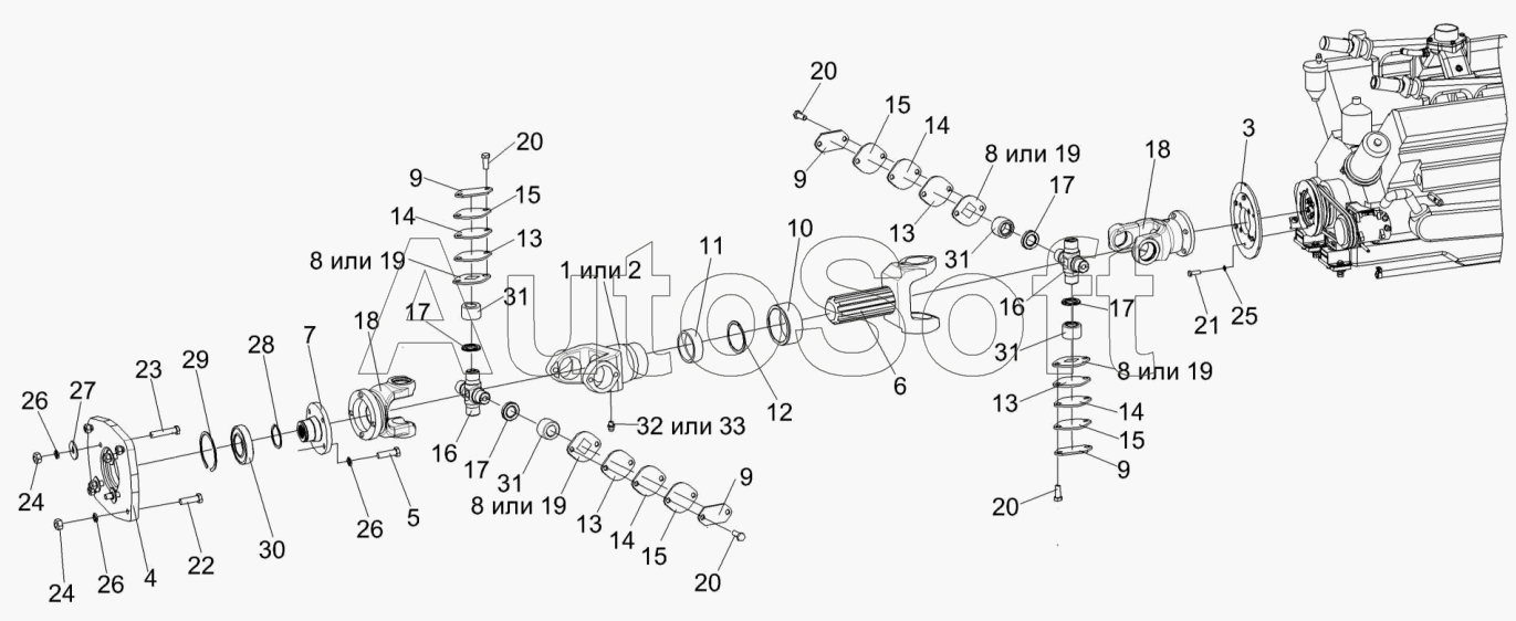 | МАЗ | МАЗ-437040 (Зубренок) (2002) | 695Н-2201023 | Вилка-фланец, присоединяемая к коробке передач | Карданная передача |