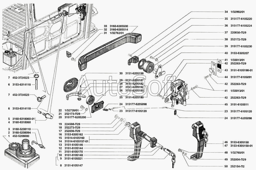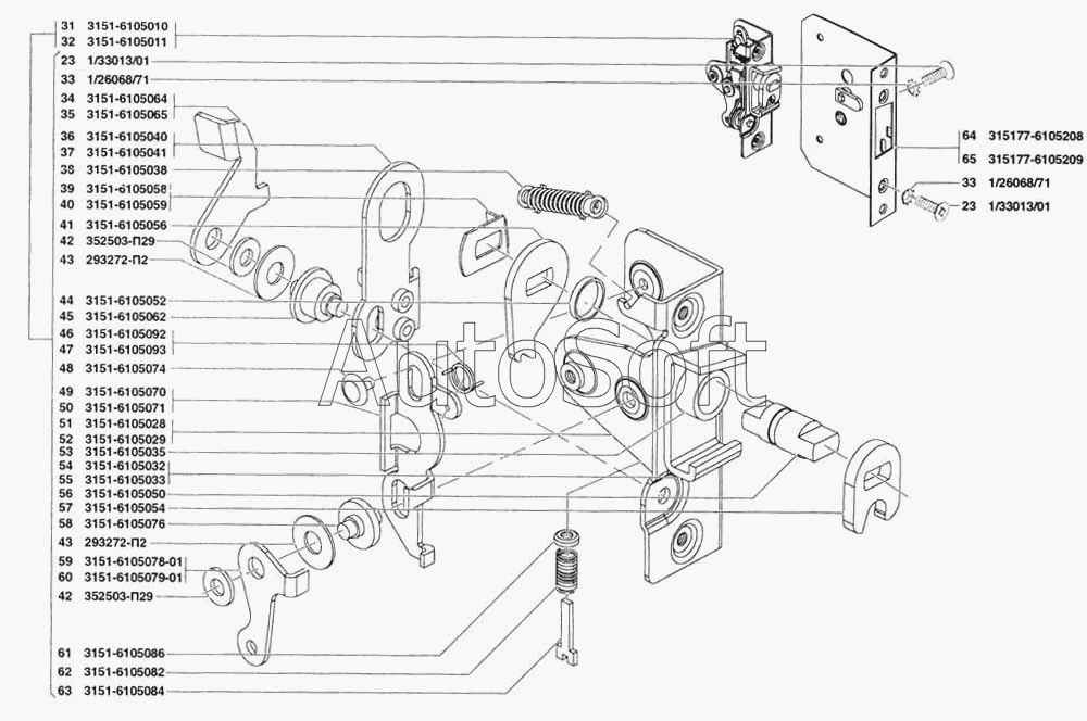 УАЗ | УАЗ-31519 (2005) | 3151-6105011 | Замок передней двери левый | Замок и ручки двери задка, омыватель стекла двери задка |