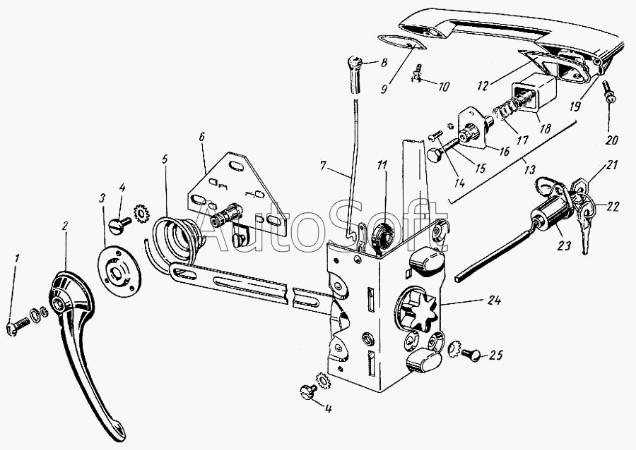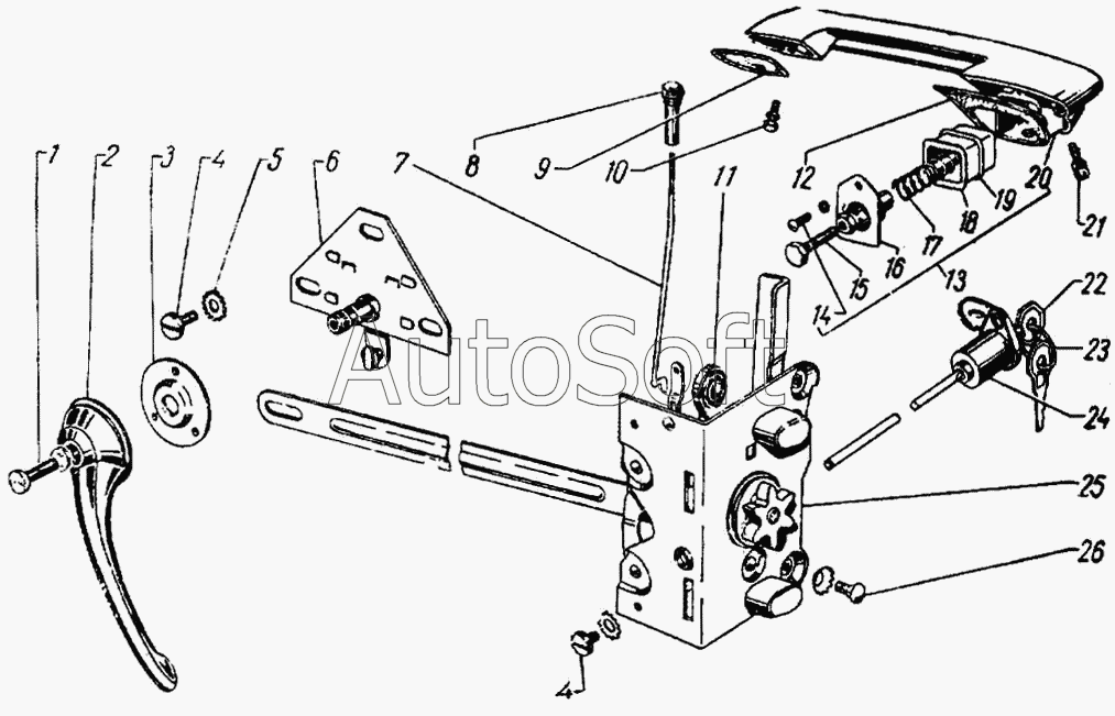 | ГАЗ | ГАЗ-21 (каталог 69 г.) (1969) | 21-6105010-Б | Замок передней двери с тягой в сборе - правый | Замок и ручки передней двери |
