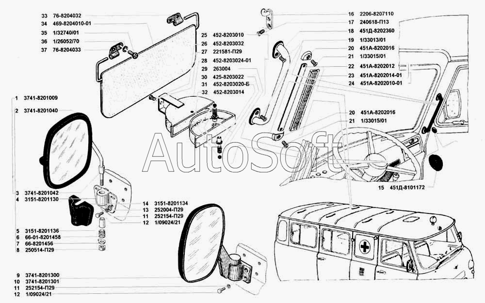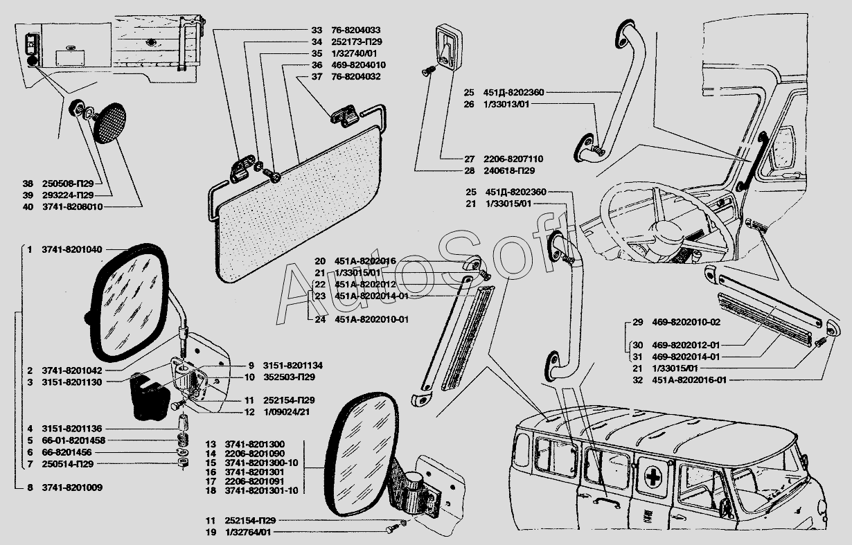 УАЗ | УАЗ-37419 (2009) | 3741-8201009 | Зеркало заднего вида | Зеркало, держатель (поручень) и крючки для одежды, козырек противоеолнечный, отражатели света |